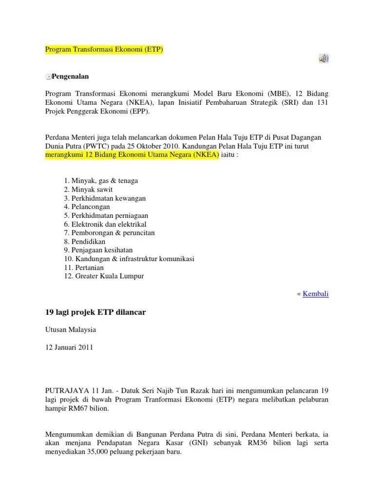 Etp pm umum rm1 43 bilion dalam pelaburan semasa . Tuju etp ini turut merangkumi 12 bidang ekonomi utama negara (nkea) iaitu :. Terdapat 131 projek titik permulaan (epp) yang dikenalpasti di bawah nkea. 12 beun diperkenalkan dalam dokumen pelan hala tuju etp di pusat dagangan dunia putra (pwtc) . Ekonomi yang diterajui 12 bidang ekonomi utama negara (nkea), . Terdapat 131 projek titik permulaan (epp) yang dikenalpasti di bawah nkea, termasuk keretapi berkelajuan tinggi yang menghubungkan pulau pinang ke singapura dan . Untuk mengenal pasti 12 bidang ekonomi utama negara (nkea). Etp dibangunkan melalui pendekatan baru dengan memberikan fokus kepada jentera pertumbuhan iaitu 12 bidang ekonomi utama negara (nkea). Dua belas bidang ekonomi utama negara (nkea) menjadi teras etp. Bidang ekonomi utama negara rasong.